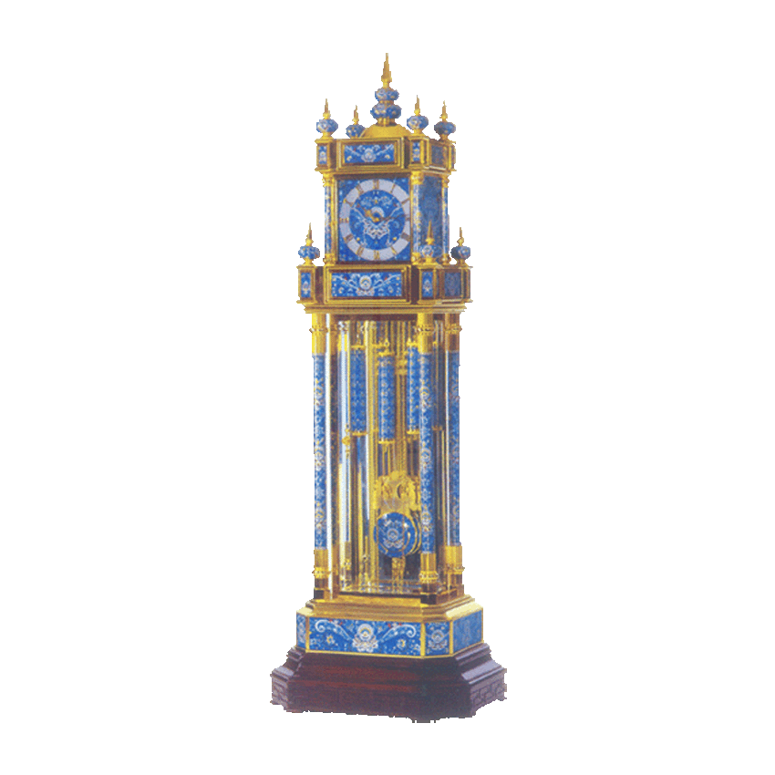 一座凸现中国特种传统工艺景泰蓝特色的落地座钟,由北京艺术学院教授、中国工艺美术大师协会副会长张同禄大师设计,并由我厂制作成功。它一亮相立即获得了2005年10月在北京举行的第二届工艺美术展特别金奖,同月又获得全国第六届工艺美术大师作品暨工美精品博览会金奖。